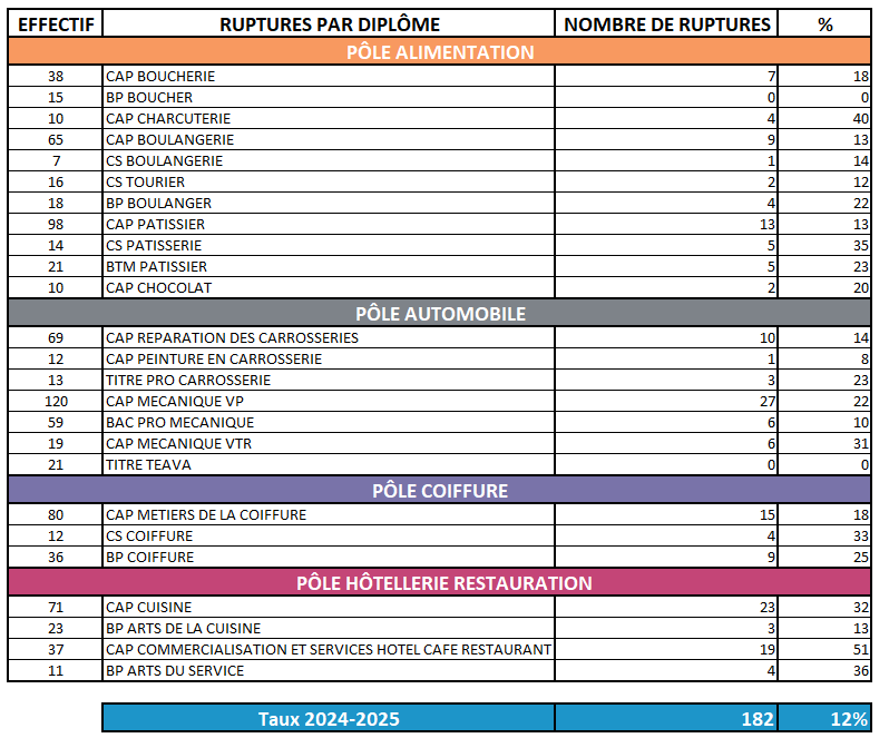 TAUX DE RUPTURE PAR DIPLÔMES 2024-2025 EN APPRENTISSAGE ET EN FORMATION CONTINUE, SANS POURSUITE DE FORMATION