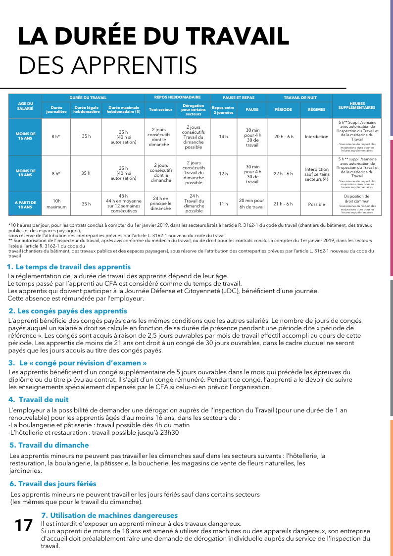 · Les apprentis de moins de 18 ans bénéficient de deux jours de repos consécutifs par semaine.