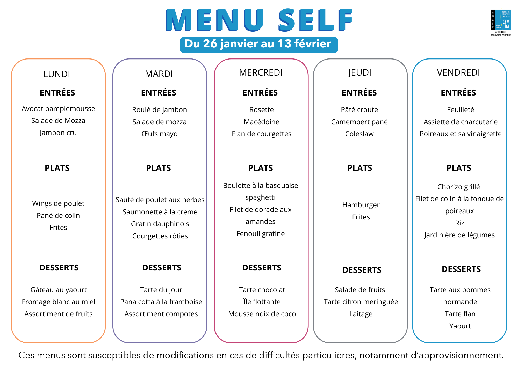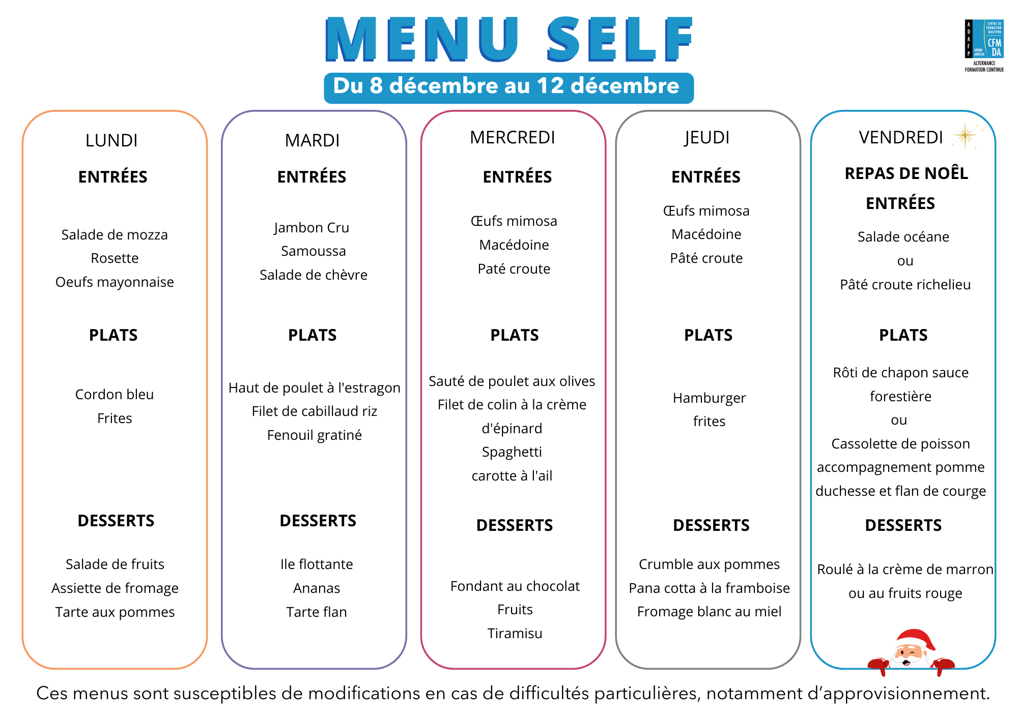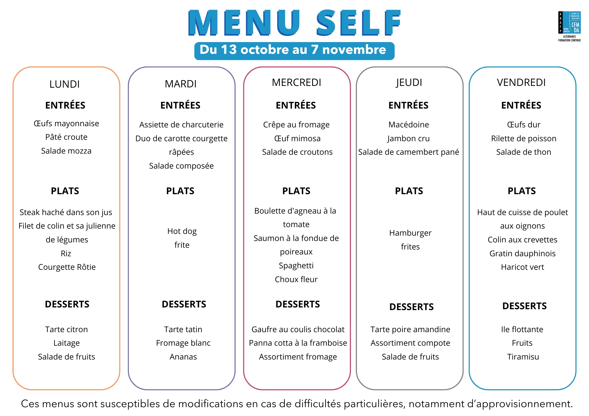 Les horaires d’ouverture : le self et le snack sont ouverts tous les midis de 12h30 à 13h30.
